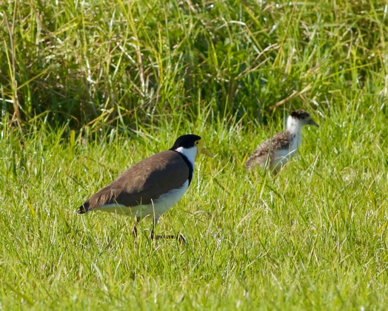 Later when I passed them again the chicks were all sheltering under a parent’s wings, which were draped over them like a snuggle blanket. The other still on guard duty nearby.